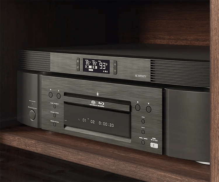 - Top of receiver: AC Infinity AIRCOM series (T8/T9/T10/S7). Low-profile, rear exhaust, smart temp control.